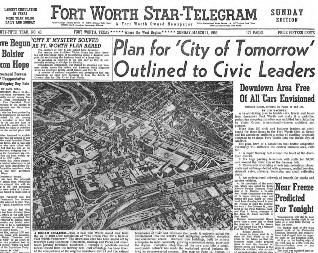 Victor Gruen was hired in the 1950’s to create a plan that would solve the traffic problems of downtown Fort Worth. The roads of the city were designed in the horse and buggy days, not to handle 70,000 cars a day in 1959 and certainly not the 152,000 cars projected by 1970.