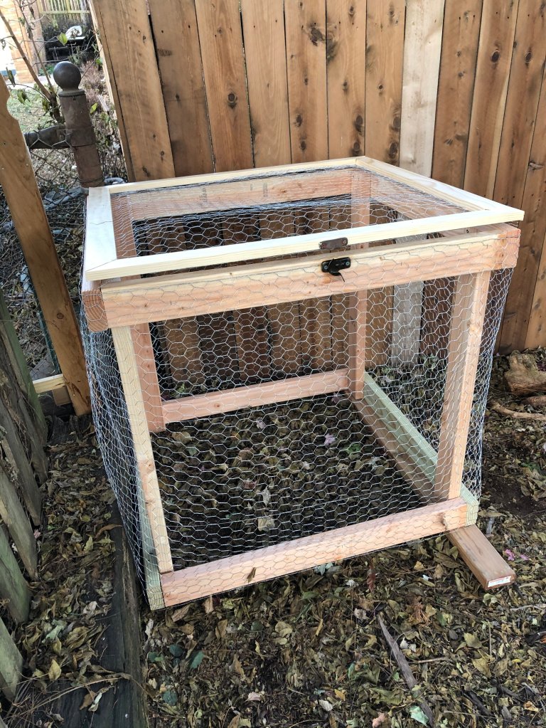 The hardest part of building the bin is screwing everything together. Just make sure you have a good drill bit and charged up drill. I started by cutting all my 2x4x6’s in half, then screwed together two squares. I used the remaining four boards as vertical braces to connect the top and bottom square. I connected the four 1 inch boards into a square to make a lid, but cut the corners at an angle (see the picture below) since they were the lid and I wanted them to look nicer. You could just assemble the boards like the base at 90 degree angles. Next I wrapped the frame in chicken wire along with the underside of the top lid made from the 1×4’s. I would recommend using gloves for this, as I managed to cut my hands on the wire several times. Last step was to attach the lid to the base using the hinges and screw in the latch. I am usually resourceful with my projects and found an old window latch to use to keep the lid closed. I have a resident raccoon terrorizing my yard so this step was very important for my bin.