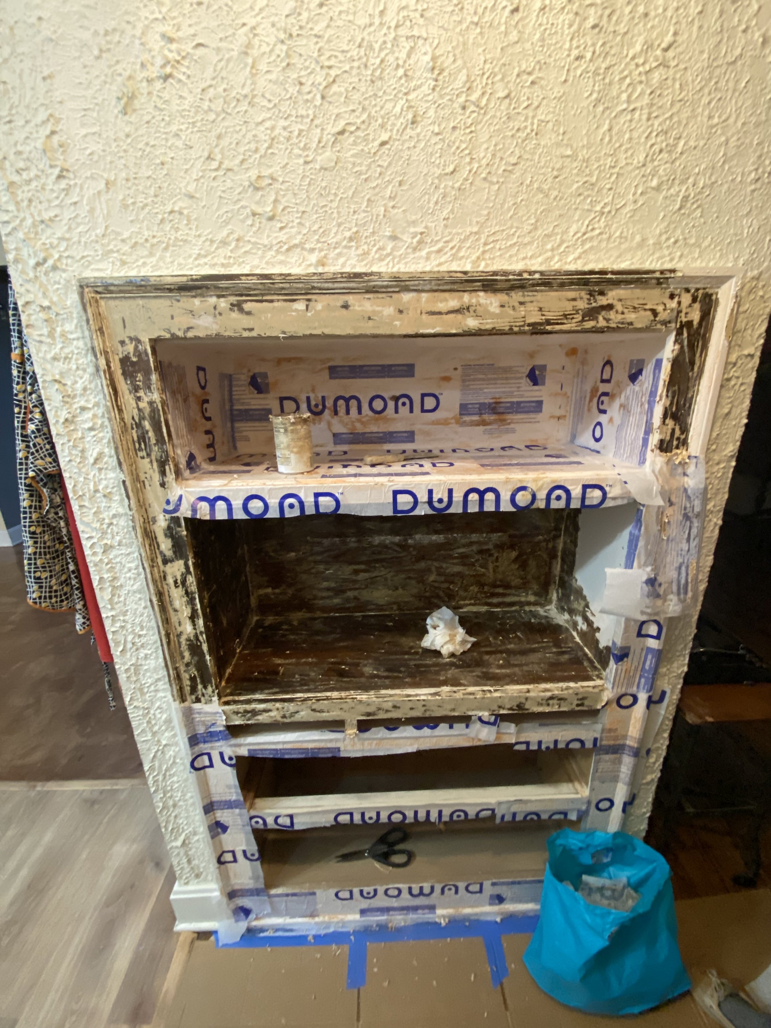 - Method of paint removal: While I didn’t attempt to use a heat gun (for costs in purchasing the heat gun and risk involved with scorching the woodwork) using paint stripper seemed the best approach. It could have gone faster with a high chemical version, but since the project was stuck in my home with questionable ventilation I opted for a healthier version. Sanding is also problematic because the sanding pads were getting gummed up and it creates a lot of dusk which is also not healthy to inhale. Thanks to COVID my house was stocked with KN95 masks to use when I did attempt sanding.