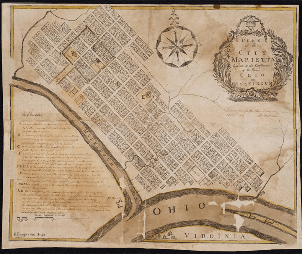Traveling back another 100 years though reveals another early preservation effort in the United States in the town of Marietta, Ohio. In 1788, Rufus Putnam, known as the father of Ohio, landed at the Muskingum River determined to make history as many city builders of the time did. He laid out the first city in the Northwest Territory not in the forced grid that became the standard in the westward expansion, but by focusing on existing site features that told the story of its past. Located in the boundaries of the new town were complex earthen architecture built by indigenous Americans between 800 BCE and 500 CE. These sacred sites served as locations of astronomical ceremony, ritual deposition, and human burial.